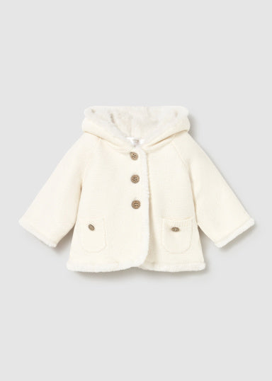 Giacca in maglia manica raglan per neonata. Cappuccio con dettagli in pellicciotto. Chiusura con bottoni nella parte anteriore. Morbida fodera interna in poliestere. Tasche funzionali nella parte anteriore.