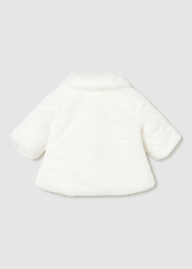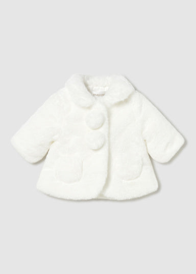 Capotto manica lunga per neonata. Colletto bebè. Chiusura con bottoni nascosti che garantirà un vestibilità rapida. Tessuto esterno in morbido pellicciotto. Fodera interna imbottita per un maggiore isolamento termico. Tasche funzionali nella parte anteriore. Elementi decorativi: pompon.