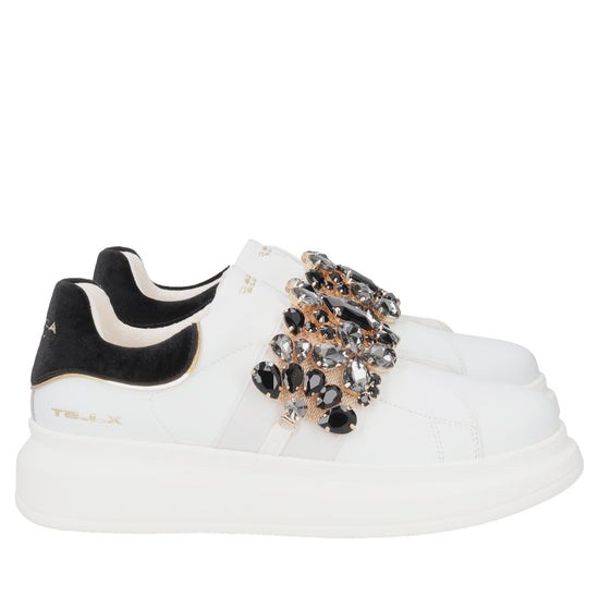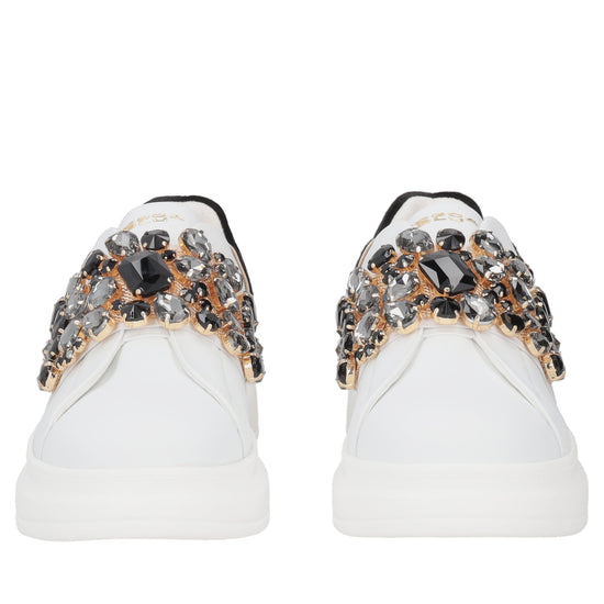 Sneaker slip-on con fascia strass colore bianco e nero. Realizzate in pelle color bianco, presentano una fascia con strass sulla tomaia.