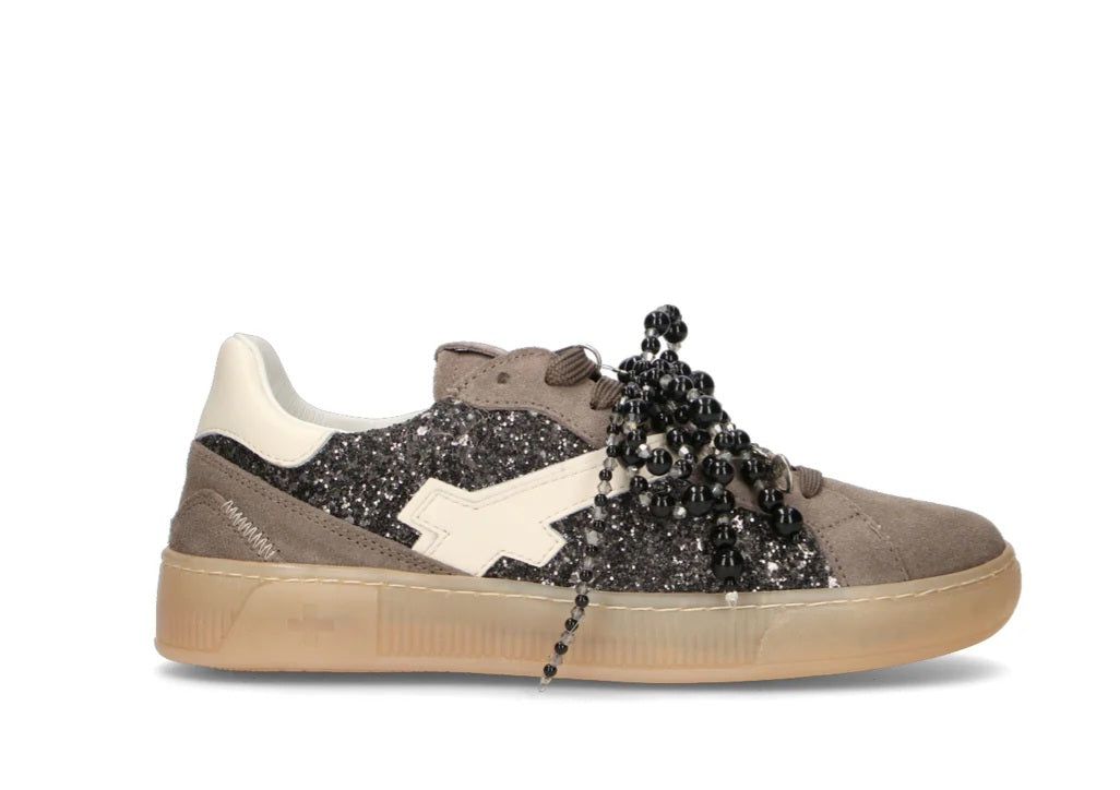 Sneakers GIO+ con dettaglio grigio e nero. In pelle scamosciata e tessuto glitter. Suola in gomma antiscivolo, lacci decorati con perline e charm.