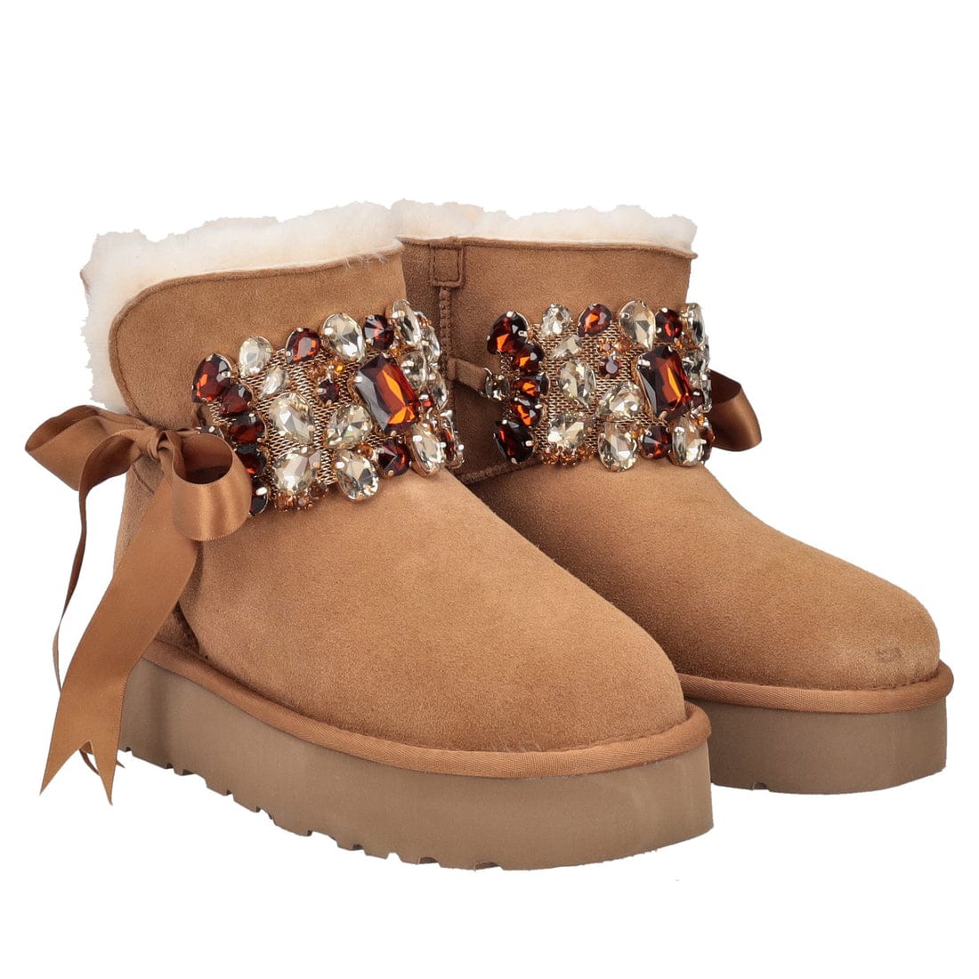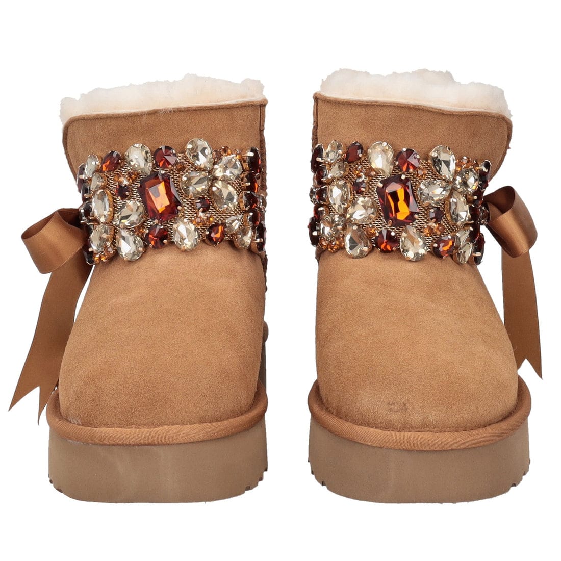 Dona un tocco extra ai tuoi look con questi stivaletti con strass in pelle scamosciata. Realizzati in color cuoio, presentano una fascia con strass colorati lungo il gambale, un tocco di femminilità che non ti farà passare inosservata. Un grazioso fiocco in raso tono su tono arricchisce la silhouette del modello. Gli stivaletti con strass sono completati da una suola platform e un rivestimento interno in morbida pelliccia.